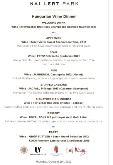 The event served as a perfect example of the great collaboration between Thailand and Hungary, bringing together the culinary flavours of two two countries, accompanied by a selection of premium Hungarian wines. The event received great honour that Chef McDang, Thailand’s leading food expert, chef and author of a number of best selling Thai language cookbooks has created the dinner menu using a mouthwatering blend of Hungarian and Thai ingredients and spices. On the sidelines of the event, several Thai wine distributors exhibited Hungarian wines at their stands.
