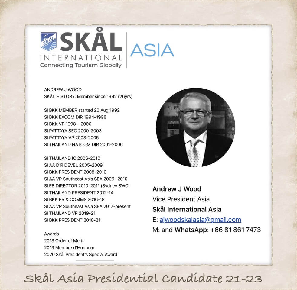 I write to you today as I reach out to all our Skålleagues, as a Presidential candidate for the Skål Asian Area which it has been my honour to serve since first elected to the board in 1995, sixteen years ago.