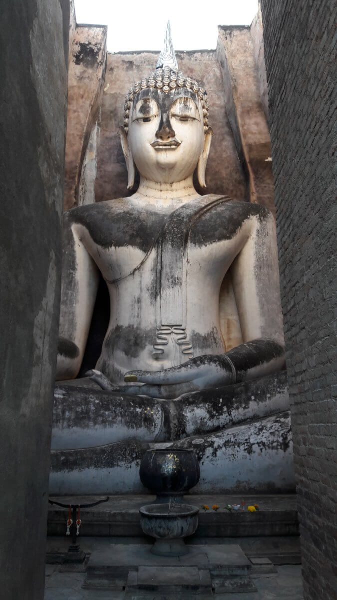 The Sukhothai Historical Park ruins are one of Thailand’s most impressive World Heritage sites. It is a great testimony of the glorious part of Thailand. The park covers an area of land totally 70 square kilometres with 193 ancient monuments, including 60 ancient monuments inside the town walls, 27 ancient monuments outside the town walls in the North, 37 ancient monuments outside the town walls in the South, 19 ancient monuments outside the town walls in the East and 50 ancient monuments outside the town walls in the West. In terms of visiting the whole compound, the ground is divided into three separate but adjoining areas. Most visitors concentrate in the central area. I found the most amazing site in the North with Wat Si Chum. The roofless mondop building enshrines a huge Sukhothai style Buddha image named Phra Achana (translated as “He who is not frightened”). It is the largest Buddha image in Sukhothai measuring 15 metres high and 11 metres wide.