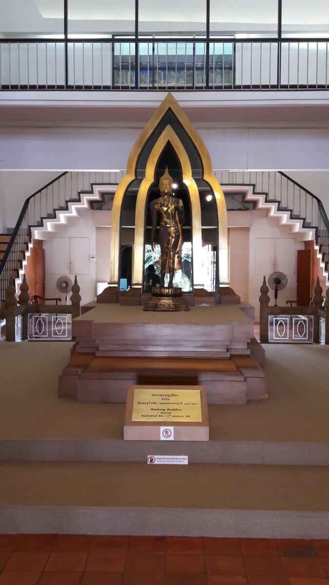 The Sukhothai style image wearing a serene facial expression occupies the total space of the mondop’s interior. At the centre of the mondop is an opening diminishing in size towards the top through which the image can be seen from the outside. Local people also refer this amiable image as “Speaking Buddha”. The architecture of Sukhothai temples is most typified by the classic lotus-bud chedis, featuring a conical spire topping a square sided structure on a three tiered base. Generally known as the Sukhothai style, these lotus-bud chedis, brick-over-stucco construction techniques present the Buddha images with a signature graceful form. Some sites exhibit other rich architectural forms introduced and modified during the period, such as bell shaped Sinhalese and double tiered Srivijaya chedi. The grounds of the historical park are so expansive and I saw so many tourists renting bicycles to joyfully enjoy the scenery at their own pace. I hope my next visit to this beautiful historical park is during the Loy Krathong festival, as it is the most important festival of the year in Sukhothai. The local guide explained that during the Loy Krathong Festival, the Sukhothai Historical Park offers exceptional evenings with performances, ceremonies, monuments illuminations, entertainment, booths of all kinds of local products and food mixed with the famous krathongs, small rafts that people launch on the pounds of the park. The night ends with a light and sound and fireworks on the pond in front of Wat Sa Si. Ramkhamhaeng National Museum The National Museum was built